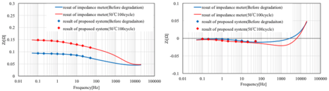 測定結果(実線:インピーダンスメータ,プロット:提案したシステム)
