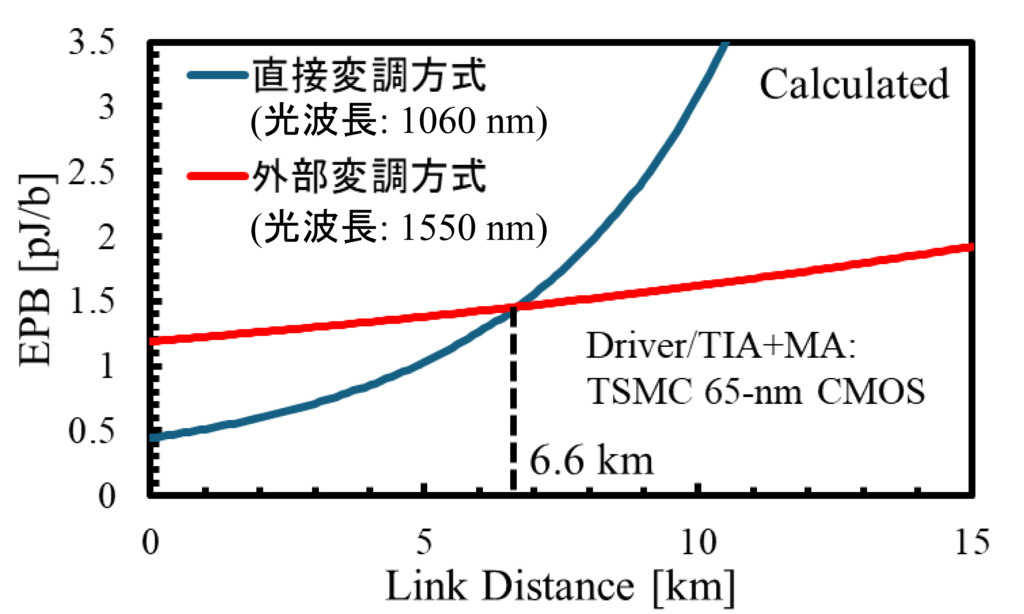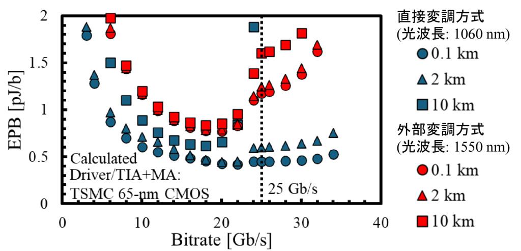 25 Gb/sの電力効率–伝送距離特性