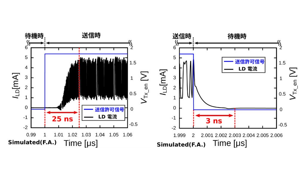 LD 駆動電流のパケット応答特性 (左:立ち上がり、右:立ち下がり)